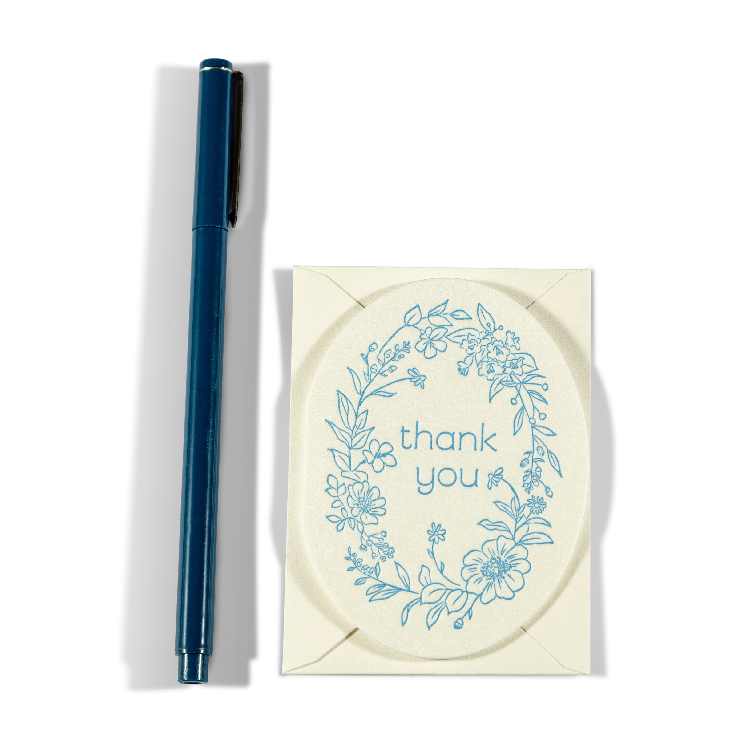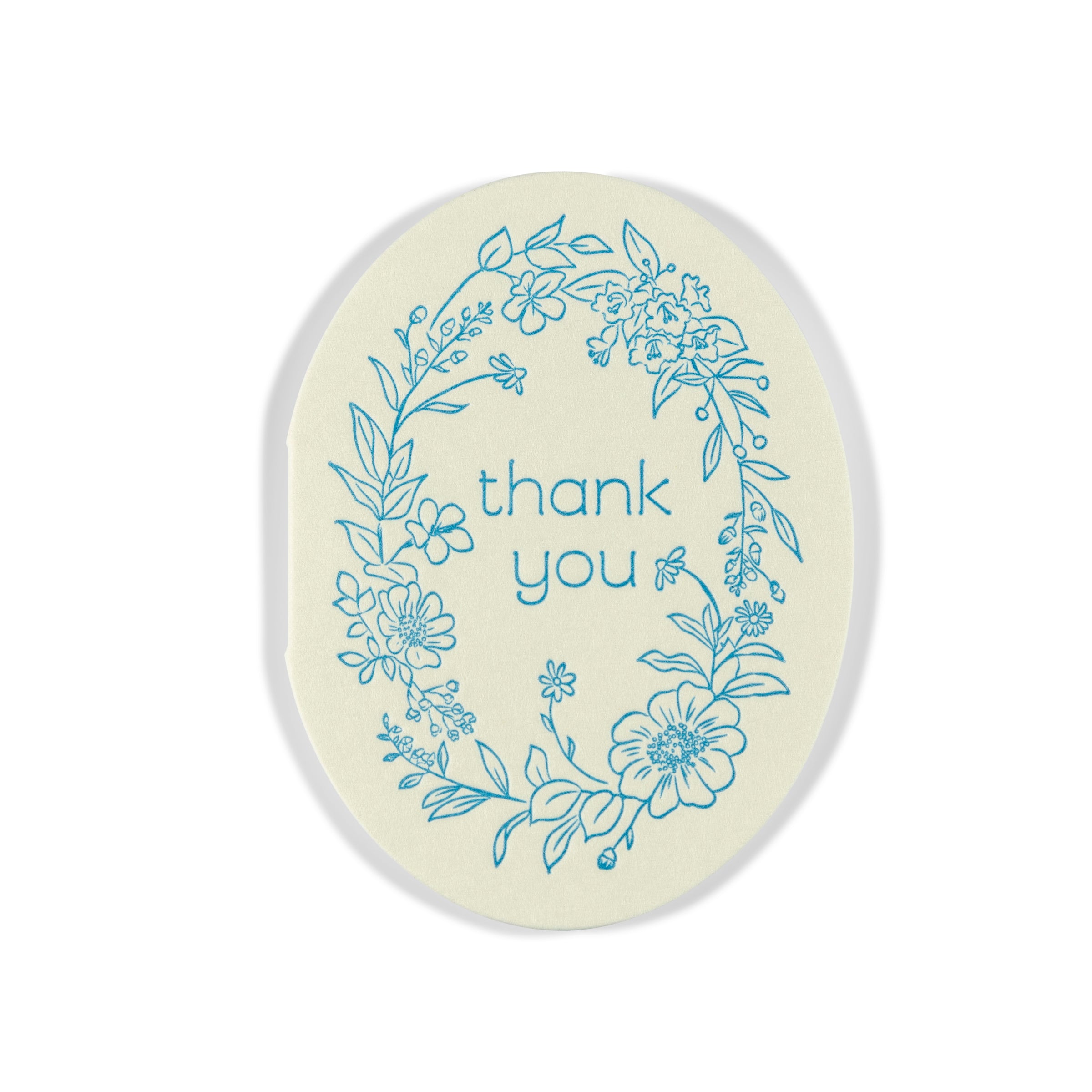 The smallest gestures often mean the most.Our mini enclosure cards are the perfect way to share a quick note of appreciation, love, or encouragement. Petite and thoughtful, they’re great as gift enclosures, place cards, or surprise desk notes. Each card comes with a small envelope (2.625” x 3.625”)—too tiny to mail, but just right for making someone’s day. This oval design features a delicate blue floral wreath surrounding a simple, heartfelt "thank you."