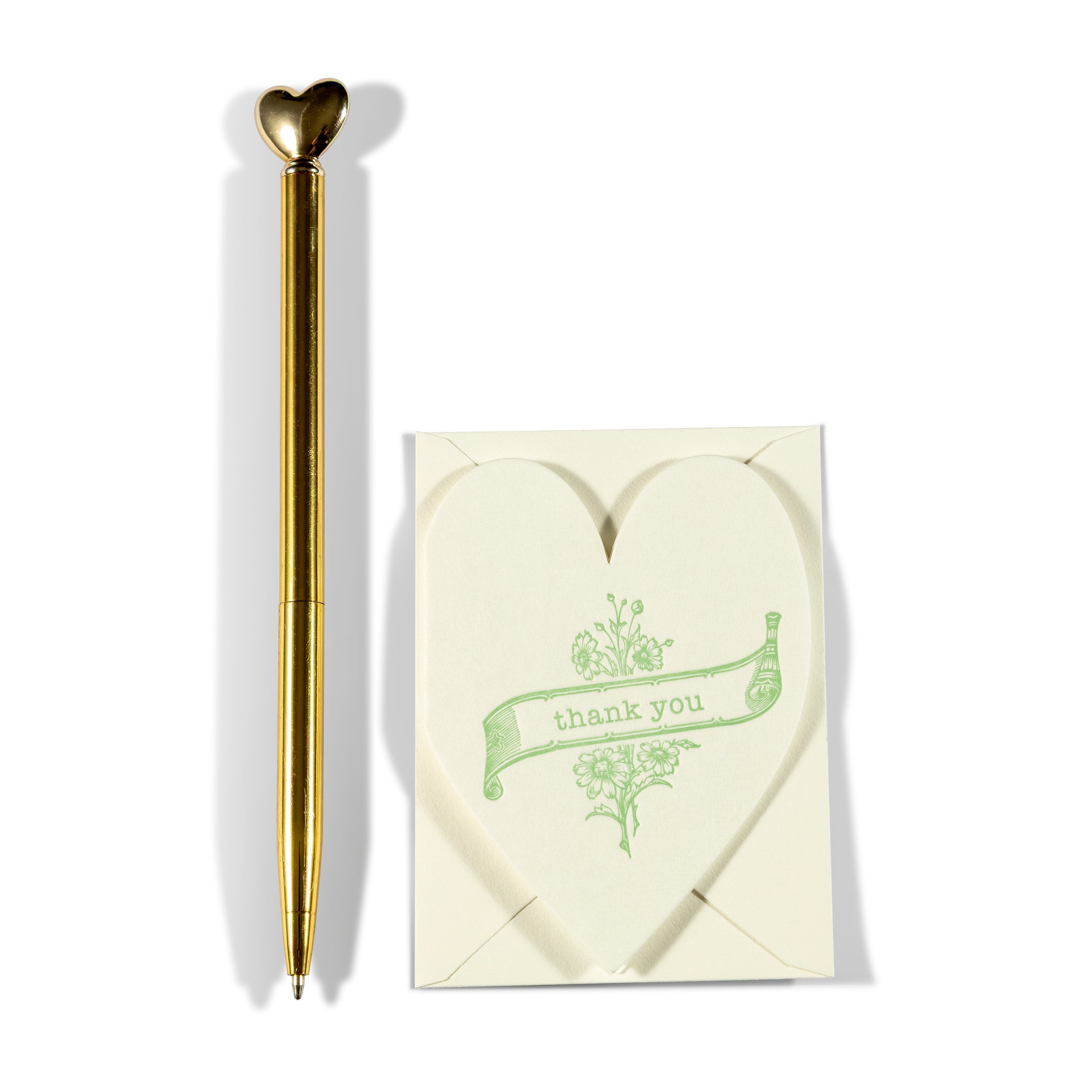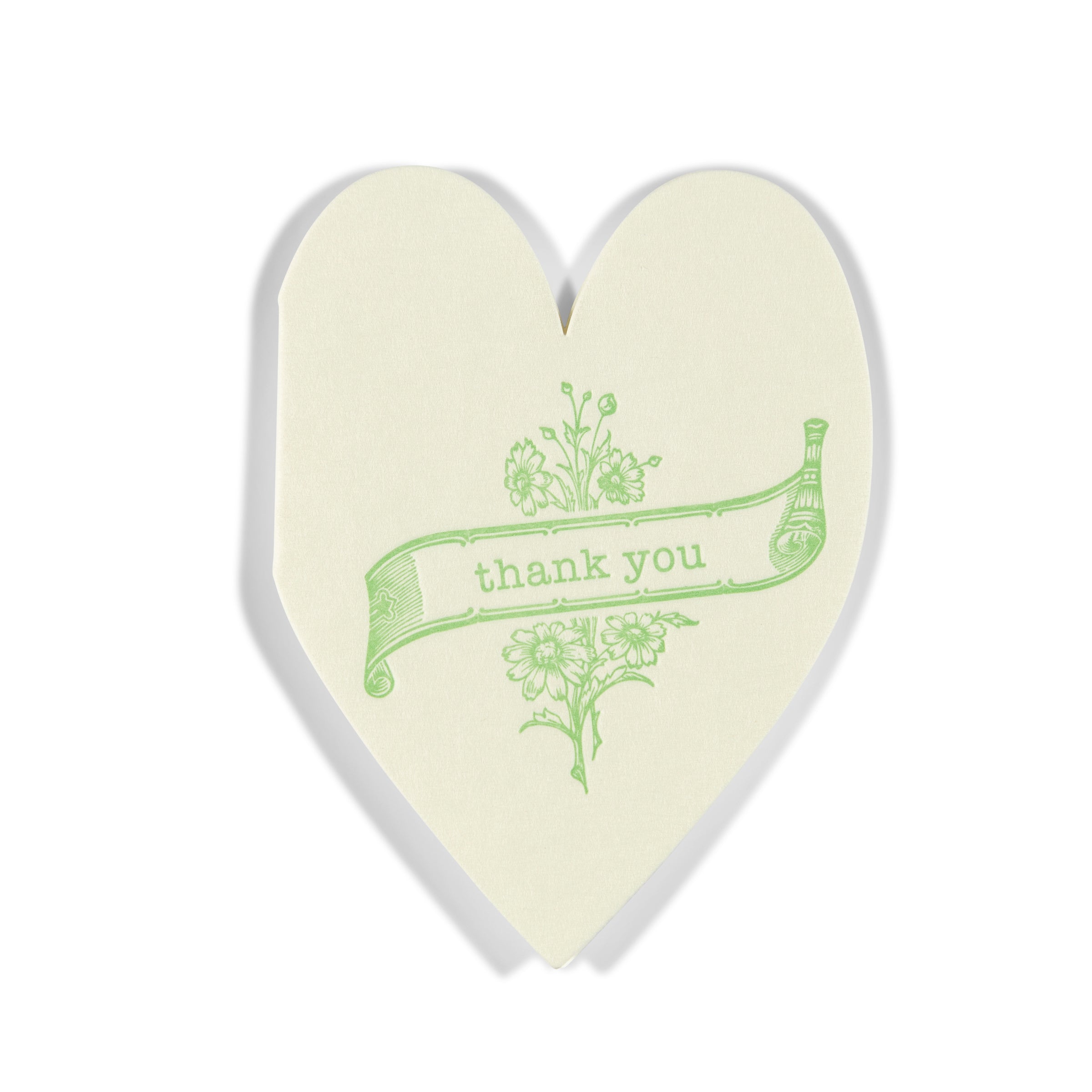 Small card, big gratitude.Our mini enclosure cards are the sweetest way to say exactly what you mean—without saying too much. Perfect as an enclosure for gifts, flowers, or thoughtful surprises, each card comes with a petite envelope (2.625” x 3.625”) and is just the right size to tuck into a present or hand-deliver. This one features a heart-shaped silhouette with a vintage-inspired green thank you banner and floral detail—simple, sincere, and a little unexpected.